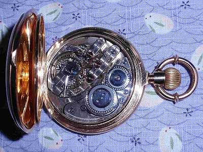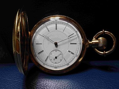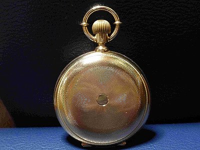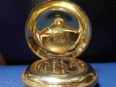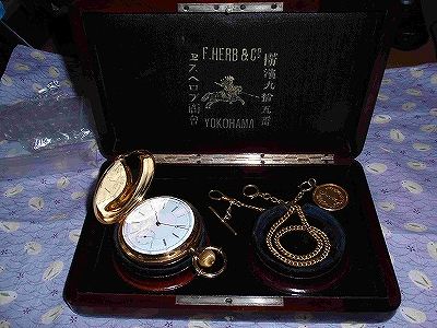 明治30年頃製造の商館時計です。アールシュミットは、当時外国人居留地であった横浜95番地に商社を構えスイスの時計を広く日本に販売していました。この時計を最初に手にした人はどんな人だったのでしょう。110年以上経っても綺麗で時計としてちゃんと役目を果たしているのは驚きです。現在の電化製品や自動車などの機械物はせいぜい20年も使えれば良い方でしょう。昔の人が作った懐中時計ってほんとにすごいものだと関心させられてしまいます。中蓋に筆記体でいろいろと書いてありますが良く判りません。読めたのはこの機械が16ルビーの仕様であるということです。18Kの刻印は、表蓋、裏蓋、中蓋のそれぞれに、あと竜頭の根元とケース枠サイドに女神の横顔のホールマークが打たれています。機械は、俗に言うゴールドトレインで2番、3番,4番歯車、天賦チラネジが金無垢、アンクルには高級時計の証であるバランサーが付いています。写真の箱は紫檀で丁寧に作られています。この箱が時計とオリジナルな物か今となっては判りませんが、同じアールシュミットのものです。付属のチェーンは22kで明治30年刻印の20円金貨のフォブが付属しています。
