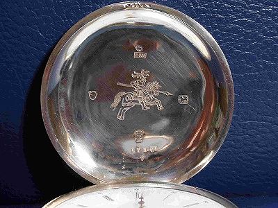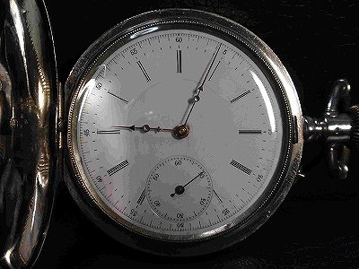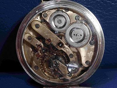 アールシュミットの商館時計です。以前偶然に立ち寄った小諸の骨董店で見つけました。ネジが一杯に巻かれたまま不動状態でしたので言い値から1万円の値引き交渉の結果、1万5千円で購入。しかし修理費用でもっとかかってしまいました。天真を別作し分解洗浄、ヒゲ修正、蓋ヒンジ部の銀のろう付け等いろいろとしていただき、しっかり時計としての機能を果たせるようになりました。 オープンフェイスの商館時計が多いのですが、これのようにフルハンターは余り見かけないです。機械はたぶん15石です。勾玉式のマイクロレギュレータ、ムスターシュ式アンクルバランサーを装備しているのが良いところでしょうか。