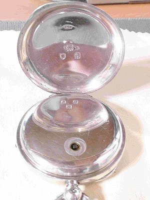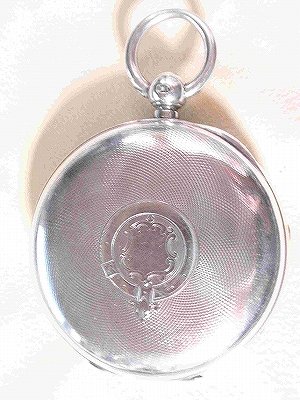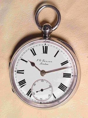 19世紀中期から後期に作られた鍵巻き式、イングリッシュレバー脱進機です。20世紀に入ってからの時計産業はクウォーツが出るまでスイスやアメリカが独断場でしたがそれ以前はイギリスやドイツ、フランスの方が技術の上でも勝っていたようです。この時計はそんな時代に作られたイギリス王室ご用達用として名声を得たベンソンの懐中時計です。鍵穴が一つでゼンマイ巻き用として使い、時間合わせは文字盤中央にカギを当て直接あわせる古いタイプです。この時計、産業革命で富を得たイギリス紳士が背広にしのばせていたのかもしれません。