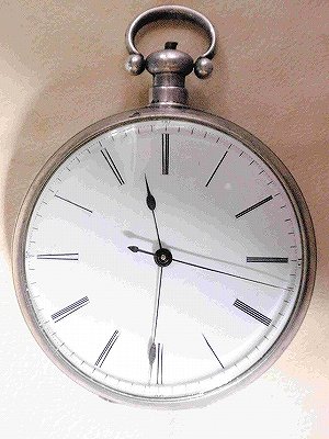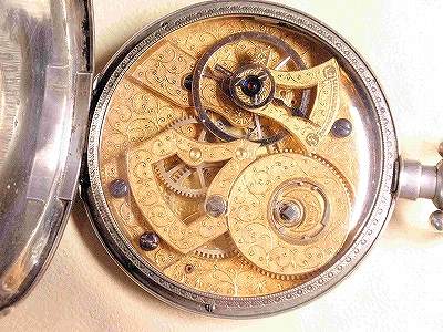 19世紀、中期から後期あたりに盛んに西洋から中国への富裕層をターゲットに輸出された典型的な様式の支那時計又は、南京時計と呼ばれている懐中時計です。特徴はなんと言っても機械に彫られた彫刻でしょう。ブリッジのレイアウトも独特です。文字盤側は中三針で全て青焼きされています。機械は鍵巻き式で、ゼンマイ巻きと時間合わせをします。機構はシリンダー脱進機で、当時としては一般的な普及タイプだったと思います。とは言っても庶民には、とても持つことは難しかったでしょう。 60ミリを超える大きさながら清楚で純白な琺瑯文字盤と繊細なローマ数字で手に持っていても大きさの違和感がありません。ゼンマイを巻きシースルーごしに機械のうごきを眺めているとつい時間が経つのを忘れてしまいそうな時計です。